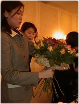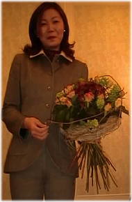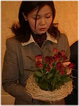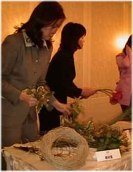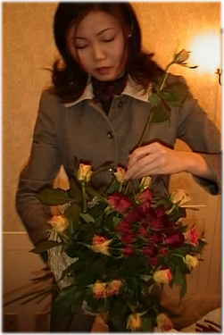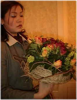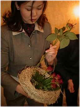 時間制限があるので…、大丈夫かなーっ。 花束のベースは、鳥かごのイメージを蔓で作りました。 (バラ 40本、ユーホルビア 10本、ヘデラベリー 5本)
